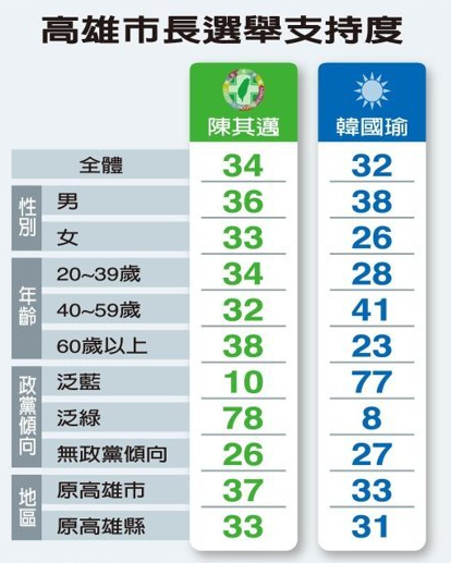 《聯(lián)合報》的最新調(diào)查發(fā)現(xiàn),高雄市選情五五波,民進黨參選人陳其邁獲得34%選民支持,32%選民則力挺國民黨參選人韓國瑜,選戰(zhàn)陷入膠著,進入到所謂的黃金交叉范圍內(nèi),韓國瑜未來的漲勢可能比陳其邁更強勁。