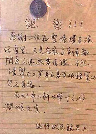 只見紙條上寫著:“巨謝!感謝二位為整棟樓表演活春宮,只是各家自有情趣,閨房之事無須借鑒,不然不費(fèi)舉手之勞平白享受服務(wù)實(shí)在受之有愧,在此奉上新臺幣10元作潤喉之資,誠惶誠恐聽眾上”,字里行間透露出被人擾了清夢的無奈。PO主也好笑地表示,一大早看到住戶的信箱貼了這個(gè),也是暈了,“半夜沒聽到聲音有點(diǎn)無言,會(huì)不會(huì)明天又貼一張變50嘞”。