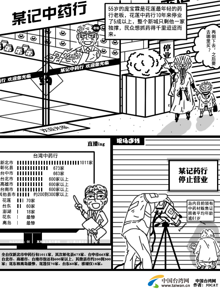 “中藥全聯(lián)會”指出,全臺僅新北市中藥行有1011家,其次彰化縣673家、臺中市663家,臺北市、高雄市、臺南市也還有600家以上,其他縣市約200到300家;花東和離島最慘,花蓮僅70家、臺東60家,澎湖僅18家。