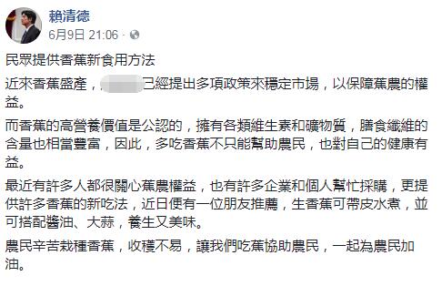 據(jù)臺灣“東森新聞云”報道,臺當局“行政院長”賴清德為幫忙促銷香蕉,10日在臉譜網(wǎng)(Facebook)發(fā)文,稱最近有許多人都很關心蕉農權益,也有許多企業(yè)和個人幫忙采購,更提供許多香蕉的新吃法。近日便有一位朋友推薦,生香蕉可帶皮水煮,并可搭配醬油、大蒜,養(yǎng)生又美味,“農民辛苦栽種香蕉,收獲不易,讓我們吃蕉協(xié)助農民,一起為農民加油”。