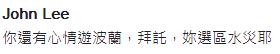 邱議瑩Facebook粉絲頁也被網友灌爆留言,“可以出來用罵薛香川的力道來檢視一下陳建仁嗎?”“怎沒見你氣到踹門、砸電視還是快中風。俊薄斑有心情去金門旅游,拜托,水災欸”“拜托,人家臺灣價值欸”“那些災民只是錄像帶啦(邱曾指場外勞工抗議是放錄像帶)”,不少網友狂用“拜托水災欸”五字洗版。