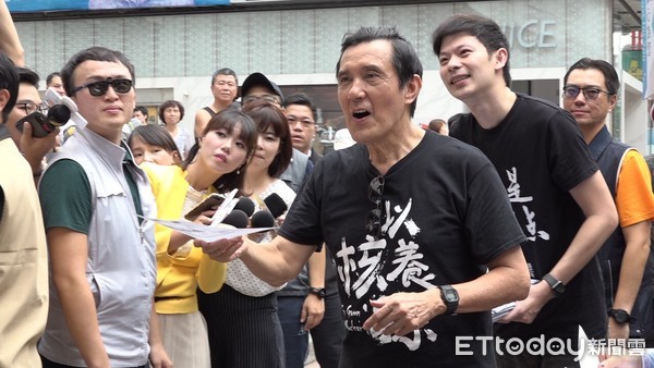 馬英九穿上“我是人,我返核”黑衣上街頭發(fā)聯署書。(圖片來源:臺灣“東森新聞云”)