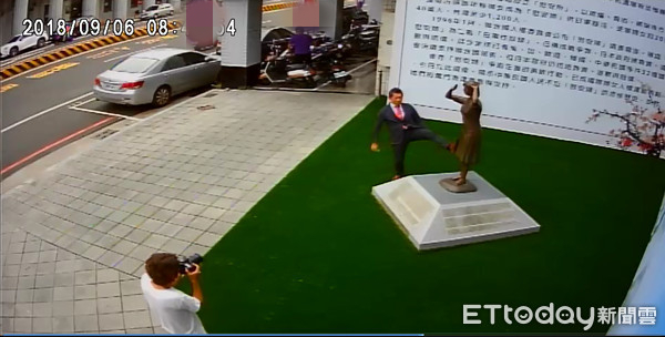 藤井實(shí)彥用腳踹慰安婦銅像的粗暴行為被監(jiān)視器全都錄下。(圖片來源:臺(tái)灣“東森新聞云”)