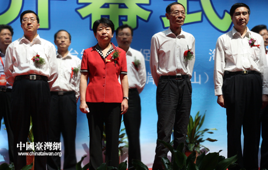 江蘇臺灣周蘇臺(昆山)農業合作洽談會今天在昆山中國國際特許中心開幕。農業部副部長高鴻賓(右二)、臺盟中央副主席黃志賢(右一)、江蘇省副省長黃莉新(前排左二)、國臺辦交流局局長李維一(前排左一)出席開幕式。(中國臺灣網 張弛 攝)