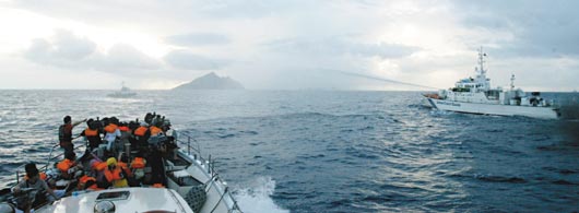 在日本巡邏船只逼靠時,保釣船領隊黃錫麟有些緊張。臺“海巡署”編號5030的五十噸巡防艇立即加速,直接擋在日本巡邏艦和“全家福”海釣船之間。