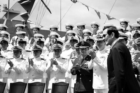就在臺軍釋放出“大陸航母威脅論”之際,臺灣地區領導人馬英九親自主持了7日舉行的“光華6號”導彈快艇成軍典禮。他不但給艦上官兵頒發“加菜金”,還與大家合影。據悉這是馬英九上任近3年來,首次出席臺軍部隊的成軍典禮。