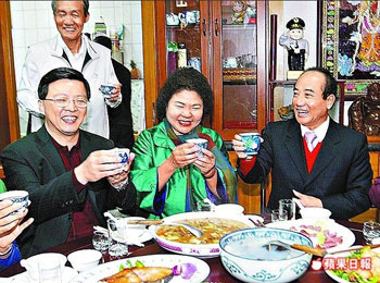 王金平春節(jié)期間都會回高雄縣路竹鄉(xiāng)老家,選定日期以“辦桌”方式邀請各界參加感恩餐會,昨晚在鄉(xiāng)內席開70桌宴請各界友人,席間有不少政壇人士,包括“立委”黃昭順、侯彩鳳、林益世等,高雄縣長楊秋興每年都會出席參加,今年也不例外,楊秋興并逐桌向與會者祝賀新年好,王金平也祝福楊秋興“心想事成”。