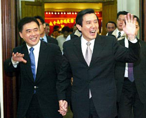 馬英九和臺北市長郝龍斌近日參加臺軍退役將領(lǐng)春節(jié)聯(lián)誼餐會,把酒言歡后手牽手走出“勝利廳”。圖片來源:臺灣《聯(lián)合報》