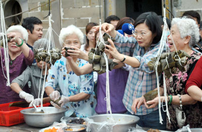 民進黨主席蔡英文13日到臺北縣貢寮鄉三合院與婆婆媽媽一起包粽子。