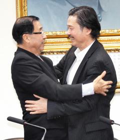 國民黨即將卸任秘書長的金溥聰(右)和將接任黨秘書長的廖了以(左),兩人在記者會擁抱兩次。圖片來源:臺灣聯合報