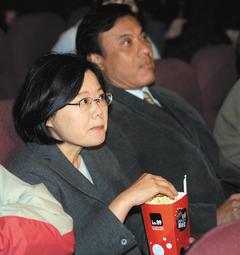 民進黨主席蔡英文(左)與民進黨秘書長蘇嘉全(右)到臺北西門町電影院觀看《雞排英雄》。圖片來源:臺灣《聯合晚報》