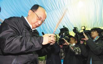 臺中市長胡志強(qiáng)昨天到殯儀館向臺中夜店大火中不幸罹難者上香,他沉重地說“大悲無言”,會全力照顧家屬。圖片來源:臺灣《聯(lián)合報(bào)》