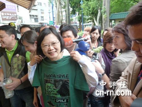 據(jù)中評(píng)社報(bào)道,民進(jìn)黨主席蔡英文昨天到臺(tái)北市著名服飾批發(fā)市場(chǎng)─五分埔商圈掃街拜票,除呼吁支持者在家等民調(diào)電話,順道捧場(chǎng)買了一件新臺(tái)幣380元的正綠色T恤。老板看到蔡英文比來(lái)比去,東瞧瞧、西看看,連忙說(shuō)要送她,蔡英文直說(shuō)不行,堅(jiān)持要用買的。