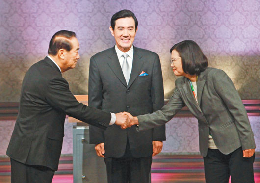 臺灣地區領導人選舉最后一場電視辯論昨天舉行,辯論前三黨候選人宋楚瑜(左起)、馬英九、蔡英文先禮后兵,互相握手致意。圖片來源:臺灣《聯合報》