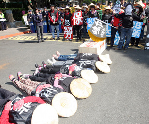 臺(tái)灣關(guān)廠工人社團(tuán)演出行動(dòng)劇表達(dá)訴求。(圖片來(lái)自臺(tái)媒)