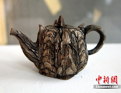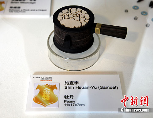 11月2日,第三屆臺灣金壺獎陶藝設計競賽展近日在臺北縣鶯歌鎮陶瓷博物館開幕。圖為展出的金獎茶壺。中新社記者 陳立宇 攝