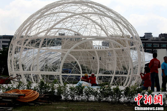 圖為寰宇庭園區內西班牙人設計的蠶繭造型作品,正在進行最后的纏繞蠶絲布置。王健 攝
