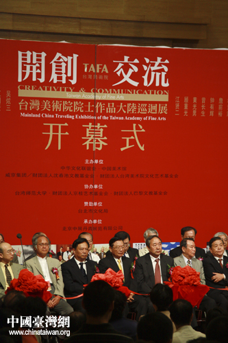 中國臺灣網8月22日北京消息 22日上午,由中華文化聯誼會、中國美術館、臺灣沈春池文教基金會、臺灣美術院文化藝術基金會主辦的《開創·交流——臺灣美術院院士作品大陸巡回展》在北京中國美術館隆重開幕。臺灣海基會董事長江丙坤、中華文化聯誼會顧問周和平、全國臺灣同胞聯誼會會長梁國揚、海協會副會長王富卿等兩岸各界嘉賓300余人出席了展覽開幕式。