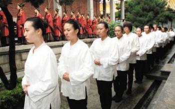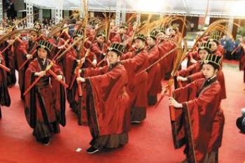 臺北市長郝龍斌擔任主祭官,他表示,由女生擔任禮生是跨時代的創舉,也象征著男女平等的觀念已深入人心。(中國臺灣網 李迪)