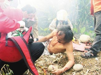 一名傷者滿臉鮮血,赤裸著上身,在現場哀嚎,救難人員正準備將他抬上擔架送醫!堵摵蠄蟆酚浾叨硒櫾z