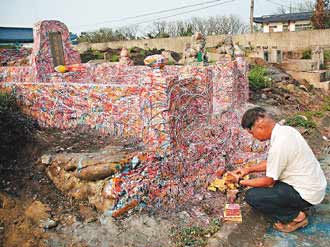 綽號(hào)鐵牛的何季諾,擅長(zhǎng)水墨畫(huà)、陶版畫(huà)、版畫(huà)及公共藝術(shù)陶藝創(chuàng)作。因媽媽的墳用塑鋼土補(bǔ)過(guò),苦思如何掩飾補(bǔ)痕,靈機(jī)一動(dòng),“來(lái)彩繪、當(dāng)成創(chuàng)作好了!”3月下旬起,只要天氣好,他就拎著油漆桶到媽媽墳前作畫(huà),自承:“我的想法異于常人。”
