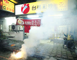 臺灣“大樂透”彩券春節加碼,30日在北縣樹林開出頭獎,一人獨得4億新臺幣,老板石小姐(右)第五度開出頭獎非常開心,笑得合不攏嘴還放鞭炮慶祝。(臺灣《中國時報》圖片)