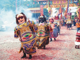 中新網2月16日電 據臺灣《聯合報》報道,“神明跳舞,超酷的!”屏東縣“合修會”電音童子團15日到高雄縣甲仙鄉參加廟會,戴上大墨鏡的每尊童子神像模樣可愛,團員們賣力地隨著電子音樂,整齊跳著“新版臺中恰恰”,在場民眾掌聲沒間斷。