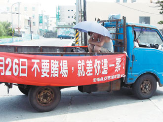 澎湖反賭聯(lián)盟因經(jīng)費有限,將卡車貼上布條,改裝成克難的“宣傳車”,志工累得坐在車上打傘遮蔭。圖片來源:臺灣《聯(lián)合報》