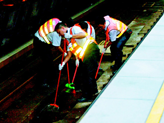 臺北捷運8日傍晚5點40分左右,一名81歲的老先生落軌,遭行進中列車撞擊,送醫不治,現場留下一攤血水,捷運站人員在警方搜證后,清理現場。圖片來源:臺灣《聯合報》