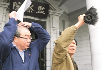 2008年12月15日國民黨“立委”邱毅前往臺灣“監察院”,遭到臺南扁友會長黃永田扯掉假發。 臺灣《聯合報》資料圖