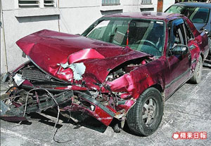 黃清海撞車后車頭全毀(下),后遇警員竟跳湖躲在岸邊樹叢(上)。來源:臺(tái)灣《蘋果日?qǐng)?bào)》