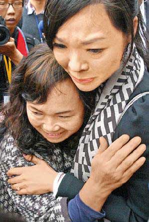 曾馨瑩(右)7日參加永齡基金會舉辦的慈善嘉年華,一名曾受幫助的馬來西亞截肢青年母親,特別伸手熱情擁抱她,無盡的感謝盡在不言中。圖片來源:臺灣《中國時報》