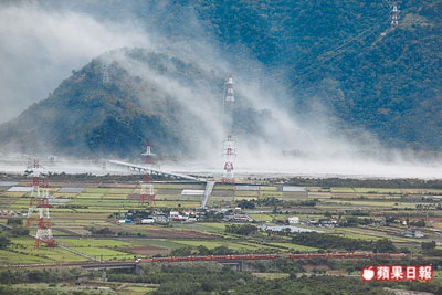 拍攝者南澳小學老師蔡沛旻說,南澳溪昨下午起風勢增長,北風不斷沿著溪谷南下,因風切效應,造成溪谷風勢特強,沙塵暴飛揚一整個下午,“第一次看到這樣大規模”!(高大林)