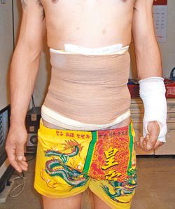 流浪漢薛祥文以繃帶固定海洛因毒品搭機回臺,穿著一條寬大“龍褲”用以遮掩,格外顯眼。圖片來源:臺灣《中國時報》