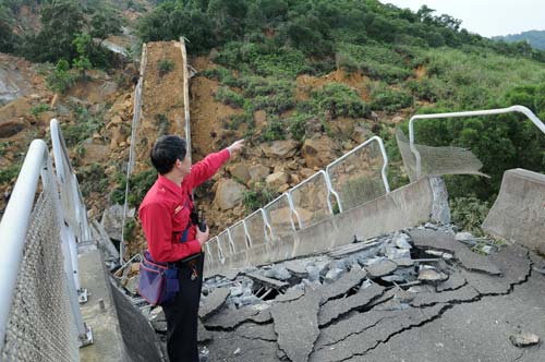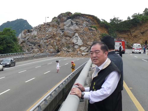 臺灣3號高速公路3.1公里處昨天下午發生嚴重山崩意外,基隆巿長張通榮(前者)昨天抵達現場后,面色凝重。(圖:《聯合報》)