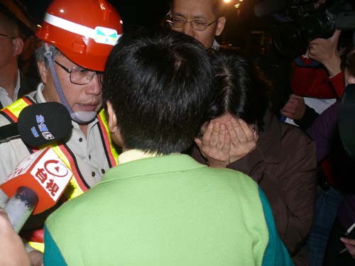臺灣3號高速公路3.1公里處昨天下午發生嚴重山崩意外,葉姓市民疑似開車被壓在土石中,她的妻子(手捂臉者),在好友陪同下趕到意外地點,傷心欲絕。(圖:《聯合報》)