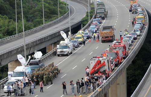 臺當局“消防署”空消直升機昨天罕見地停在因走山而中斷的臺灣3號高速公路上。(圖:《聯合報》)