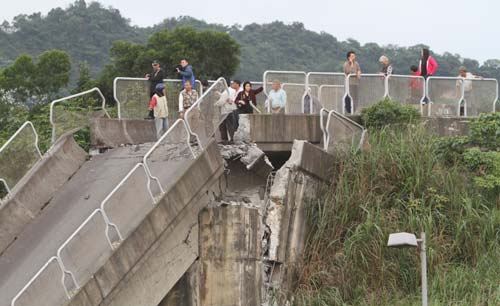 臺灣3號高速公路3.1公里處昨天發生嚴重走山意外,南下、北上都被土石流封阻,面積至少有1、2座足球場大,一處人行跨越橋隨之倒塌。(圖:《聯合報》)