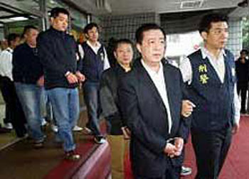 臺(tái)北市警方逮捕黑幫“天道盟太陽(yáng)會(huì)特攻隊(duì)”隊(duì)長(zhǎng)凌志成(前排右二)等9名嫌犯。 圖片來(lái)源:臺(tái)灣《中國(guó)時(shí)報(bào)》