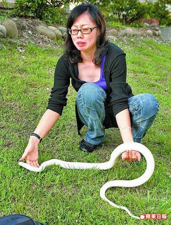 新竹縣男子李哲能,19年前開(kāi)始培育白化臺(tái)灣南蛇當(dāng)寵物,常趁好天氣到文化中心草皮“遛蛇”,引來(lái)路人把玩,小朋友還要求父母買蛇回家當(dāng)寵物。