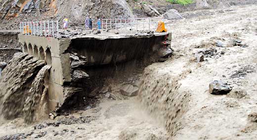 高雄縣六龜鄉(xiāng)六龜大橋便橋昨晨遭暴漲的荖濃溪水沖毀,已封閉。(圖:《聯(lián)合報》)