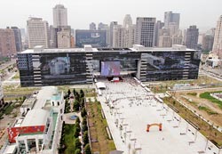臺(tái)中市新市政大樓的正面入口處有全亞洲最大的LED電視墻。來(lái)源:臺(tái)灣《中國(guó)時(shí)報(bào)》