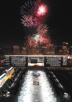臺(tái)中市新市政中心昨晚舉行點(diǎn)燈儀式,新市政中心燈火通明與璀璨焰火互相輝映,照亮臺(tái)中市夜空。來(lái)源:臺(tái)灣《聯(lián)合報(bào)》