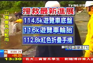 據報道,救援人員在蘇花公路112.8公里處找到一支紅色折疊手機,但由于電池已經耗損,所以無法確認手機的擁有者。不過手機上的維修標簽是繁體字,可能是失聯的臺灣人士所有。