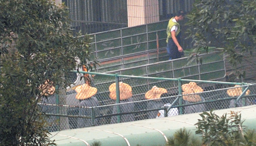 上周五,斗笠隊第一次出現時,民眾只是奇怪。昨天,民進黨籍“立委”郭榮宗等人特別會見陳水扁時,臺北監獄安排一隊戴著斗笠的受刑人,成一字縱隊陪陳水扁走出舍房,沿途所經,還加上綠色帆布阻隔,只見上下是一張張斗笠和一只只腳快速移動,中間是綠色帆布,場景有如日本“忍者”。