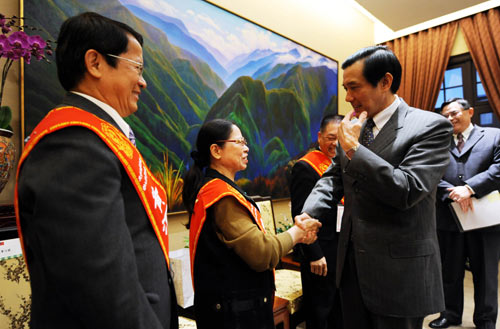 馬英九(前右)23日在官邸,接見(jiàn)臺(tái)東愛(ài)心菜販陳樹(shù)菊女士(左2)等2010年臺(tái)灣好人好事代表,贊揚(yáng)他們的善行充分展現(xiàn)了正直、善良等臺(tái)灣核心價(jià)值。 圖片來(lái)源:“中央社”