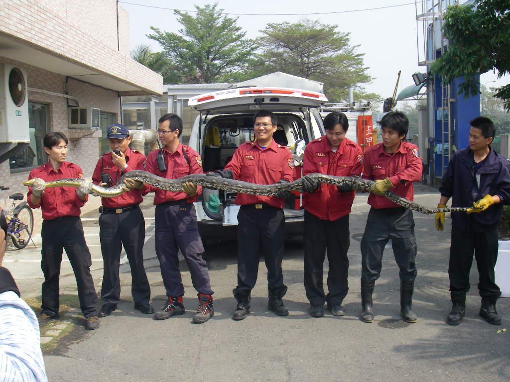 據(jù)報道,高雄市消防局今天中午接到報案指出,高雄市某高速公路截流站的排風管上方突然出現(xiàn)不速之客——一條超級大蟒蛇。因蟒蛇十分巨大,先到現(xiàn)場的兩名消防隊員不敢輕舉妄動,于是通報勤務中心,后來連同6名支援隊員合力將蟒蛇擒獲。
