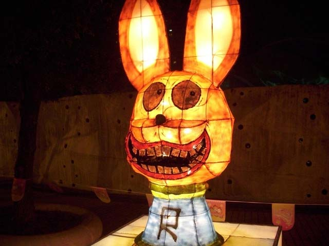 據報道,網友robbie2010受朋友之邀參觀燈會,當他經過入口附近的彩繪花燈區時,卻被這組可怕的兔子燈籠嚇到:只見這只“殭尸兔”張著血盆大口,露出臟兮兮的牙齒,還有不懷好意的笑容;最令人感到不安之處,就是它的眼睛呈現詭異的“上吊狀”,好像正在打量來往的游客們。