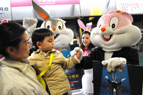 2011高雄春天藝術節“兔寶寶大鬧交響宴”草地音樂會26日將登場,經典卡通人物兔寶寶22日搭高雄捷運為演出造勢,受到小朋友歡迎。 圖片來源:“中央社”