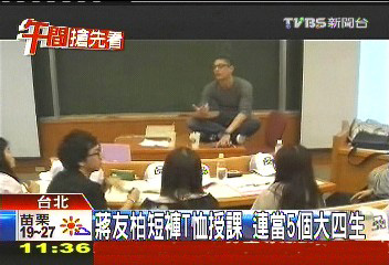 中國臺灣網4月25日消息 據臺灣TVBS電視臺報道,今年剛剛進入臺灣亞洲大學教書的蔣友柏,已經開除5個學生,日前還把學生們帶到自己的公司上課,穿短褲、T恤,還抽煙飆臟話,小腿上看來像刺青的圖案也很吸睛。不過學生們大都認為,蔣友柏老師直接告知社會現實面,讓大家收獲很多。蔣友柏也稱這就是他最想教給學生的東西。